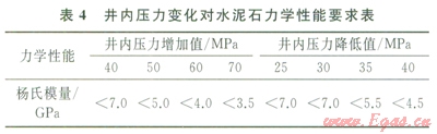 彈性水泥石具備了低楊氏模量、彈性變形能力強(qiáng)的特點(diǎn),能與套管、井壁協(xié)調(diào)變形,有效卸載,大幅度降低微裂隙及微環(huán)隙形成的可能性。由公式(1)、(2)計(jì)算出當(dāng)井內(nèi)壓力變化時(shí),為避免水泥環(huán)破壞,需將水泥石楊氏模量降至適當(dāng)范圍(表4)。以斯倫貝謝為代表的典型彈性水泥石,楊氏模量在3.5~5.5GPa,泊松比約為0.22,抗拉強(qiáng)度在2.2~2.5MPa,在儲(chǔ)氣庫(kù)得到成功應(yīng)用,固井質(zhì)量?jī)?yōu)質(zhì),在經(jīng)過(guò)試壓及下一次開(kāi)鉆鉆進(jìn)井內(nèi)壓力變化后,固井質(zhì)量依然良好,未出現(xiàn)氣竄。
