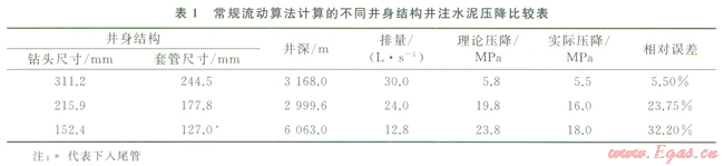 在對(duì)小間隙井進(jìn)行注水泥平衡壓力設(shè)計(jì)時(shí),通常用常規(guī)井的流動(dòng)計(jì)算方法,但現(xiàn)場(chǎng)施工結(jié)果顯示:用常規(guī)方法計(jì)算的小間隙流動(dòng)壓力的誤差較大。表l對(duì)比了不同井身結(jié)構(gòu)井注水泥過(guò)程的壓降情況,Æ311.2mm鉆頭ׯ244.5mm套管為常規(guī)井的井身結(jié)構(gòu),利用常規(guī)流動(dòng)算法計(jì)算出的壓降值為5.8MPa,實(shí)際壓降為5.5MPa,兩者的誤差較小,僅為5.5%。但Æ215.9mm鉆頭ׯl77.8mm套管、Æl52.4mm鉆頭ׯ127.0mm套管屬于小間隙,采用常規(guī)方法汁算的壓降與實(shí)際值相對(duì)誤差較大,偏高23%~33%。從理論角度,這主要是由小間隙環(huán)空的自身特點(diǎn)所決定的:小間隙環(huán)空比常規(guī)井的環(huán)空間隙小很多,環(huán)空間隙的減小引起流體流態(tài)、流變性產(chǎn)生較為明顯的變化,原有的流體判別方式、摩阻系數(shù)等計(jì)算方式不能適宜于小間隙中流體的實(shí)際流動(dòng)情況。同時(shí),常規(guī)算法中忽略套管偏心、裸眼井段邊壁效應(yīng)等因素的影響,而這些在小間隙中卻比較突出。