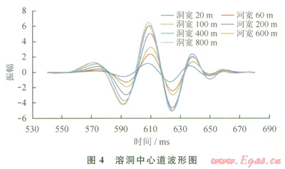 以長方形溶洞模型為例,提取偏移數(shù)據(jù)溶洞響應(yīng)中心道,其波形圖如圖4所示。由圖4可見:各個地震道除振幅強弱不同外,其波形特征大致相同,為兩強谷夾一強峰且峰強于谷的特征;各道波形時長大致相同,這說明溶洞地震響應(yīng)時長與溶洞寬度沒有必然聯(lián)系;振幅雖然隨著溶洞橫向尺度的增大而增大,但是增大的幅度是在不斷減小的,尤其當(dāng)溶洞寬度大于200m后,溶洞對應(yīng)的最大波峰振幅的增加近乎停止。