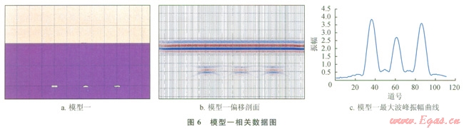 圖2-b是橢圓形溶洞偏移剖面,圖2-c為橢圓形溶洞最大波峰振幅曲線圖;圖3-b、圖3-c分別是菱形溶洞偏移剖面及最大波峰振幅曲線圖??梢钥吹?,無論是橢圓形模型還是菱形模型,隨著溶洞橫向尺度的增加最大波峰振幅是增加的,這和長方形溶洞正演模擬結(jié)果很相似。