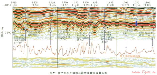 圖9為某區(qū)塊連井剖面與其儲層段最大波峰振幅曲線疊合圖。由圖9可見,這些井除井2、井6外,都設(shè)計在“串珠”或“羊排”這些具有溶洞反射特征的位置上,同時它們都對應(yīng)著最大波峰振幅曲線的極大值點,且井l、井3、井4、井5和井7都有鉆具放空、鉆井液漏失等表征溶洞發(fā)育的證據(jù),而井2位于兩“串珠”之間,井6未在“串珠”上,這兩口井均無放空漏失現(xiàn)象,即是無溶洞發(fā)育,可見振幅曲線出現(xiàn)極值是溶洞反射特征之一,但并不是所有極值都意味著溶洞發(fā)育。隨著這些井對應(yīng)振幅的減小,其產(chǎn)量總的來說是減小的,而產(chǎn)量作為一種衡量溶洞大小及發(fā)育程度的指標(biāo),可見反射振幅越大的溶洞,其尺寸越大,發(fā)育程度越高,這與前面的結(jié)論是相符合的。所以通過這種手段識別溶洞,可指導(dǎo)實際生產(chǎn),提高鉆探成功率。