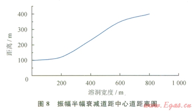圖8為不同寬度溶洞反射的振幅衰減至最大振幅一半時對應(yīng)地震道距溶洞中心道的距離圖,這一屬性可以反映溶洞在剖面上的響應(yīng)寬度隨溶洞寬度的變化情況。從圖中可以看到,隨著溶洞寬度的增加,半幅衰減道與中心道距離是不斷增加的,增大幅度是先變大再變小,在菲涅爾帶半徑附近增大幅度達到最大。