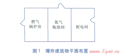 2012年6月某燃?xì)鉄犭姀S發(fā)生爆炸,造成兩死一傷。爆炸地點(diǎn)位于燃?xì)怆姀S內(nèi)的一座附屬建筑物(現(xiàn)澆框架式結(jié)構(gòu))內(nèi),爆炸建筑物平面布置見圖1。監(jiān)控錄像顯示,爆炸發(fā)生前有兩名人員先后進(jìn)入配電間,2min后發(fā)生爆炸,爆炸沖擊波半徑超過30m。約l5min后消防及救援人員趕到現(xiàn)場,使用消火栓撲滅零星明火。事故現(xiàn)場勘察顯示,配電間3面外墻向外坍塌,建筑物內(nèi)2面隔墻均向燃?xì)忮仩t房方向垮塌。配電間內(nèi)有兩排配電柜,無超大型變壓器設(shè)備,多個(gè)配電柜門被炸飛,配電柜內(nèi)有燒結(jié)痕跡。氮?dú)馄俊⒌獨(dú)鈪R流管及安全放散管(放散口設(shè)置在室內(nèi))傾倒在燃?xì)忮仩t房與氮?dú)馄拷M間之間的隔墻一側(cè),放散口有積碳現(xiàn)象,放散口上方墻體有噴射火焰燃燒過的痕跡。