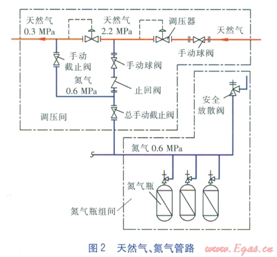 燃?xì)鉄犭姀S內(nèi)的氮?dú)夤?yīng)系統(tǒng)用于天然氣管道置換,氮?dú)馄拷M間與天然氣調(diào)壓間相隔僅30m左右,天然氣、氮?dú)夤苈芬妶D2。