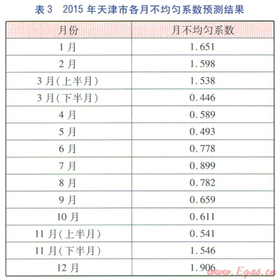 2015年天津市各類用戶天然氣用量預(yù)測結(jié)果見表2。由表2可知,2015年最大用氣量將達(dá)到164.02×108m3,并作為計(jì)算2015年季節(jié)調(diào)峰儲氣量的基礎(chǔ)數(shù)據(jù)。2015年天津市各月不均勻系數(shù)預(yù)測結(jié)果見表3,由于3月15日、ll月15日分別為供暖期結(jié)束和供暖期開始時間,因此這兩個月的上下半月不均勻系數(shù)變化較大。