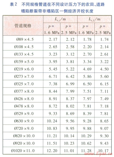 采用前面計算方法,分別計算出農(nóng)田、道路塌陷區(qū)對應的上,并將表1數(shù)據(jù)代入式(16),可計算得不同規(guī)格管道在不同設計壓力下農(nóng)田、道路塌陷斷裂帶非塌陷區(qū)一側經(jīng)濟開挖長度Le,t、Le,L,見表2。