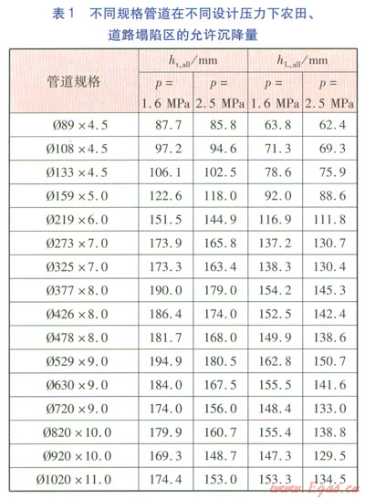 由式(9)~(12)可計算得到,不同規(guī)格管道在設計壓力分別為1.6、2.5MPa下,農(nóng)田、道路塌陷區(qū)的允許沉降量(見表l)。