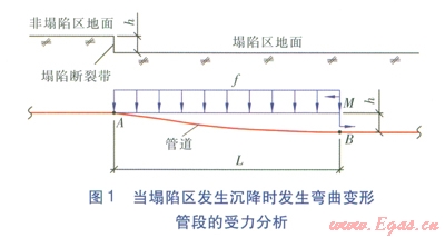 在正常情況下,管道自重(包括供熱介質重量)加上部土壤重量等于管道下部土壤的支撐力,無論是有補償管道還是無補償管道,管道不會出現(xiàn)彎曲變形。然而,當塌陷區(qū)發(fā)生沉降時,由于管道的連續(xù)性,塌陷斷裂帶的塌陷區(qū)一側部分管段將發(fā)生彎曲變形(見圖l),并出現(xiàn)懸空現(xiàn)象,使得管道上部出現(xiàn)均布荷載,直至彎曲變形終止。當塌陷區(qū)發(fā)生沉降時發(fā)生彎曲變形管段的受力分析見圖l。