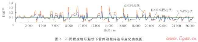 模擬計(jì)算得到不同程度地形起伏下凝析氣管道內(nèi)持液率的沿線分布曲線如圖6所示。從圖6可以看出,在無地形起伏的條件下,管路沿程持液率基本保持不變,平均持液率為0.1;而存在地形起伏的情況下(對(duì)照?qǐng)D6和圖3),管內(nèi)持液率隨沿線地形起伏的變化出現(xiàn)了不同幅度的波動(dòng),且地形起伏高度越大,持液率波動(dòng)的幅度也越大,在上坡管段內(nèi)持液率相對(duì)較大,下坡管段內(nèi)持液率相對(duì)偏小。分析這種地形高差對(duì)持液率影響較大的原因是:上升管段內(nèi)流體在爬坡過程中壓降損失比較嚴(yán)重,管內(nèi)壓力下降相對(duì)較快,氣相體積膨脹,使得氣相流速加快,攜液能力增強(qiáng),致使持液率隨地形高差的增加而增大;反之亦然。