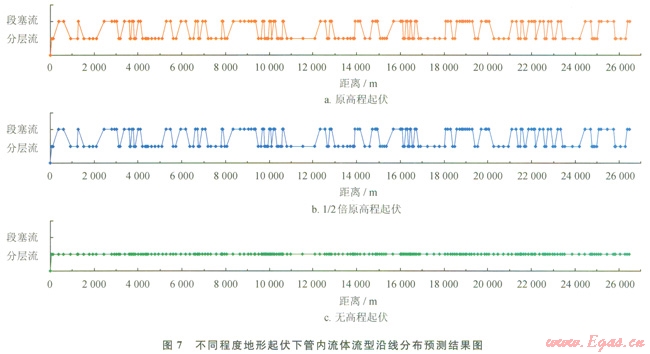 不同程度地形起伏下凝析氣混輸管內(nèi)流體流型沿線分布預(yù)測(cè)結(jié)果如圖7所示。從圖7可以看出,管路沿線在無地形起伏存在的情況下,管內(nèi)流體流型為分層流;在有地形起伏的情況下,管內(nèi)存在兩種流型,即分層流和段塞流,且沿線地形為原高程起伏和l2倍原高程起伏下的流型分布大致相同,上傾管路內(nèi)流型為段塞流,下傾和水平管路內(nèi)流型為分層流??梢?,管路沿線地形的起伏使得管內(nèi)流型呈現(xiàn)出極不穩(wěn)定的狀態(tài),在分層流和段塞流間不斷地發(fā)生轉(zhuǎn)變。