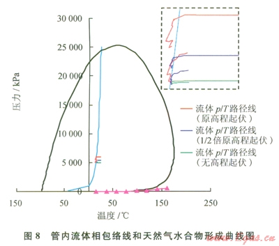 凝析氣混輸管內(nèi)流體的相包絡(luò)圖和天然氣水合物形成曲線預(yù)測(cè)結(jié)果如圖8所示。圖8中右上角虛線框圖是對(duì)不同程度地形起伏下管內(nèi)流體PT路徑線的局部放大圖。圖8中的天然氣水合物形成曲線左側(cè)與相包絡(luò)線圍成的區(qū)域?yàn)樘烊粴馑衔镄纬蓞^(qū)(天然氣具備生成天然氣水合物的壓力和溫度)。模擬結(jié)果顯示,在管路沿線存在地形起伏的情況下,管內(nèi)流體PT路徑線有一部分位于天然氣水合物形成區(qū)內(nèi),再加上所模擬的凝析氣井井流物中含有游離水,所以這部分管段內(nèi)會(huì)有天然氣水合物生成,且原高程起伏下管內(nèi)有突然水合物形成的區(qū)域(或管段)l2倍原高程起伏下的管內(nèi)天然氣水合物區(qū)域更大一些;而沿程無地形起伏時(shí)管內(nèi)凝析氣PT路徑線全部位于天然氣水合物區(qū)外側(cè),說明水平管內(nèi)無天然氣水合物生成。