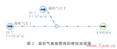 在凝析氣的PVT分析報(bào)告中,通常提供的是凝析氣井井流物中天然氣和凝析油的組成分析數(shù)據(jù),并未將水組分納入其中,因此,計(jì)算前需將天然氣、凝析油和水按照現(xiàn)場(chǎng)實(shí)際產(chǎn)量進(jìn)行混合,得到完整的井流物組分?jǐn)?shù)據(jù),并以此作為組分模型的輸入,然后開展模擬計(jì)算分析。利用PIPHASE搭建的組分合成模擬和管網(wǎng)系統(tǒng)模擬的流程如圖1、2所示,利用該流程即可開展模擬計(jì)算。