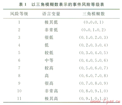 將引起燃?xì)夤艿佬孤┦录L(fēng)險(xiǎn)分為11個(gè)等級(jí)[8],相應(yīng)的語言變量及模糊數(shù)參照表l,語言變量可直觀表達(dá)風(fēng)險(xiǎn)因素的相對重要性。