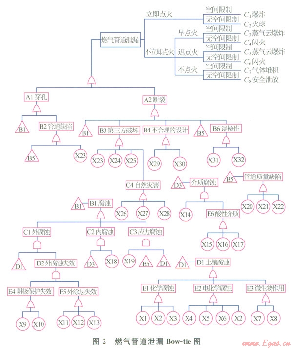 城市燃?xì)夤艿赖娘L(fēng)險(xiǎn)取決于管道失效的可能性和事故后果的嚴(yán)重性[3],為將燃?xì)夤艿朗鹿实那耙蚝蠊Y(jié)合起來進(jìn)行風(fēng)險(xiǎn)評價(jià),首次引入Bow-tie模型,將風(fēng)險(xiǎn)分析中的故障樹和事件樹聯(lián)系起來。Bow-tie模型最早出現(xiàn)在澳大利亞昆士蘭大學(xué)關(guān)于帝國化學(xué),工業(yè)公司危害分析的課程講義[4],隨后殼牌公司將其應(yīng)用于阿爾法鉆井平臺(tái)爆炸災(zāi)難分析中[5],至今這一技術(shù)已被廣泛應(yīng)用到一些重大事故。