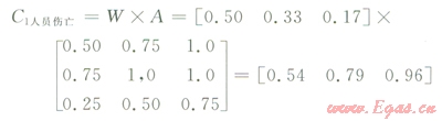 在計(jì)算結(jié)果事件后果影響時(shí)將后果因素的權(quán)重與其相應(yīng)的評價(jià)模糊數(shù)按矩陣乘法進(jìn)行合并[13]。如C1事件造成的第二級(jí)因素人員傷亡的后果計(jì)算如下。