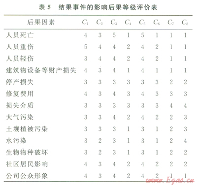 專家小組成員可參照三角模糊數(shù)表示的后果等級(jí)表,將燃?xì)夤艿佬孤┰斐傻谋ā⒒鹎?、蒸氣云爆炸、閃火、氣體堆積以及安全泄放分別帶給人員、財(cái)產(chǎn)、環(huán)境、社會(huì)的影響后果進(jìn)行評價(jià),評價(jià)結(jié)果見表5。