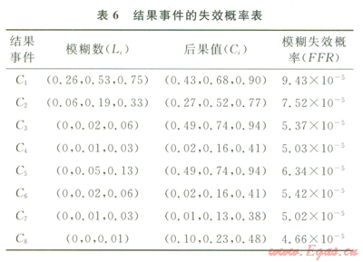 對燃?xì)庑孤┑娘L(fēng)險(xiǎn)評價(jià)可根據(jù)風(fēng)險(xiǎn)值RiLi×Ci,由于計(jì)算的可能值和后果都以模糊數(shù)表示,所以為對比風(fēng)險(xiǎn)大小,應(yīng)用式(6)(9),將其轉(zhuǎn)化為表6中的各結(jié)果事件的模糊失效概率值(FFR)。
