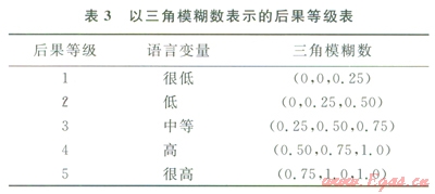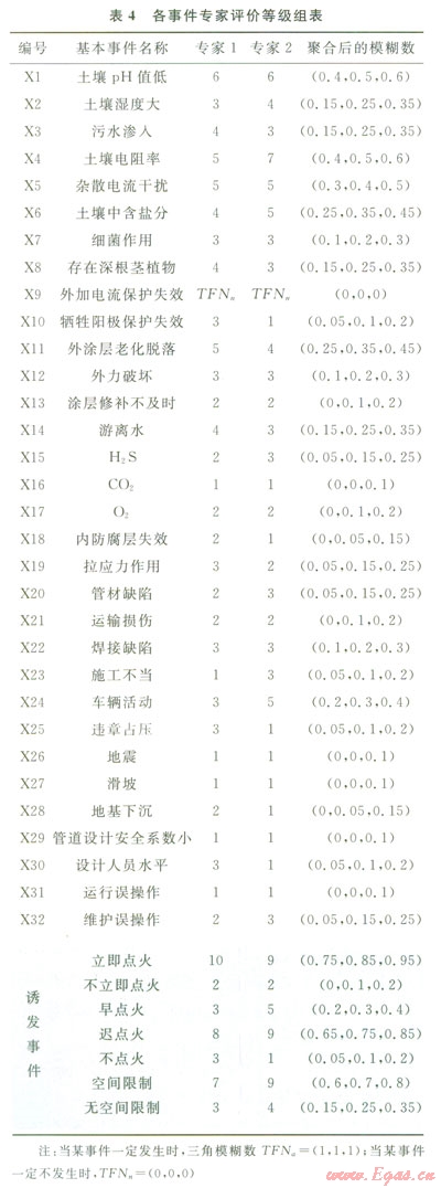 首先邀請有經(jīng)驗(yàn)的專家組成評價(jià)小組,冉對專家進(jìn)行權(quán)重分析,本文僅以兩位專家為例,并且賦予其相等的權(quán)重。依據(jù)故障樹中基本事件和事件樹中誘發(fā)事件的風(fēng)險(xiǎn)大小,由號(hào)家賦予每個(gè)事件相應(yīng)的三角模糊數(shù),評價(jià)結(jié)果見表4,然后根據(jù)式(5)求得聚合后的事件模糊數(shù)。