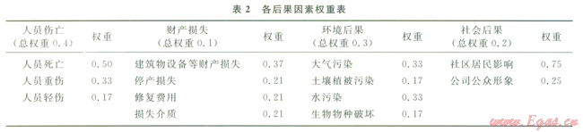 應(yīng)用本文參考文獻(xiàn)[12]中的公式求得權(quán)重為(W人員傷亡,W財(cái)產(chǎn)損失W環(huán)境后果,W社會(huì)后果)(0.4,0.1,0.3,0.2),同理求得第二級(jí)因素的權(quán)重(2)。