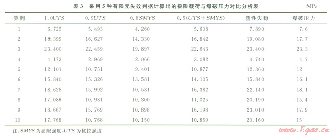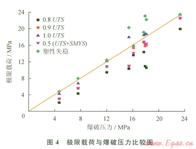 從圖4可以直觀地看}H:當(dāng)管道缺陷最深處的平均Von Mises等效應(yīng)力達到極限拉伸強度l.0UTS時,計算出的管道極限載荷最接近真實爆破壓力值;當(dāng)Von Mises等效應(yīng)力等于0.8UTS、0.9UTS0.5(UTS4-SMYS)時得到的極限載荷過于保守,都小于真實爆破壓力值;而當(dāng)達到塑性失穩(wěn)時,得到的極限載荷值部分大于真實爆破壓力,具有不安全性。