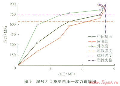 3l0組爆破試驗有限元計算的內(nèi)壓應(yīng)力曲線圖(以編號為l模型為例),取中間節(jié)點的曲線做插值計算。分別計算當(dāng)中間節(jié)點的Von Mises等效應(yīng)力等于0.8UTS、0.9UTS、1.OUTS、0.5(UTS+SMYS)和塑性失穩(wěn)時的壓力值。