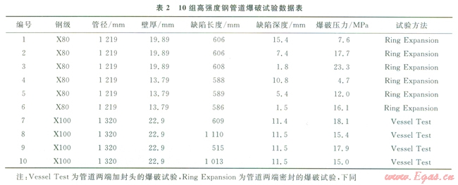 收集了10組含腐蝕缺陷的高強度管道的爆破試驗數(shù)據(jù),本試驗使用X80Xl00高強度鋼材料[8-9],材料參數(shù)見表l