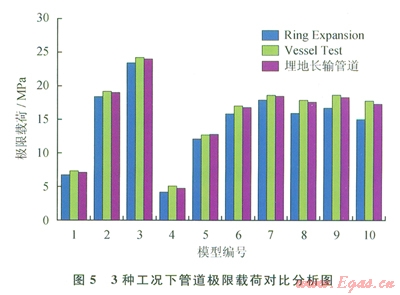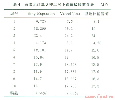 基于已確定的適合高強度管道的失效判據(jù),采用有限元分析方法模擬3種工況下管道的失效情況。圖53種情況下計算出的極限載荷做了對比分析。表43種丁況下管道極限載荷的對比值,通過對比分析可看出:加封頭的爆破試驗與埋地管道的預(yù)測極限載荷吻合度更高,l0組誤差的標(biāo)準(zhǔn)偏差值為2.06%;兩端密封的爆破試驗比埋地管道的預(yù)測極限載荷要小,l0組誤差的標(biāo)準(zhǔn)偏差值為3.64%。在實際工程試驗中,建議用加封頭的爆破試驗來預(yù)測埋地管道的極限載荷;用兩端密封的爆破試驗來預(yù)測真實埋地管道的失效情況,得到的預(yù)測結(jié)果偏保守。