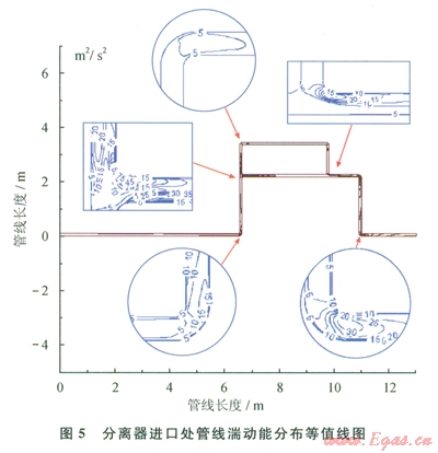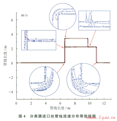 介質(zhì)在管道輸運(yùn)過程中,由于其內(nèi)部流道的變化,局部的流速會(huì)遠(yuǎn)遠(yuǎn)高于整體流速,加之紊流作用影響,因此必定會(huì)加劇影響腐蝕速率。圖1所示管線的內(nèi)流場模擬結(jié)果見圖4、5所示。