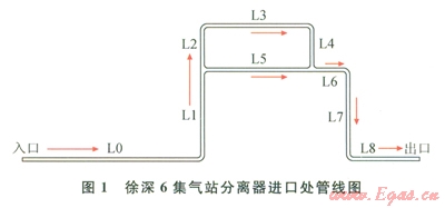 工況以大慶油田徐深6集氣站為例(圖1),管道材質(zhì)為20G,管徑為89mm,運(yùn)行壓力15.1MPa,溫度55℃,氣相中含水率為0.001336%。管線各段長度見表l。
