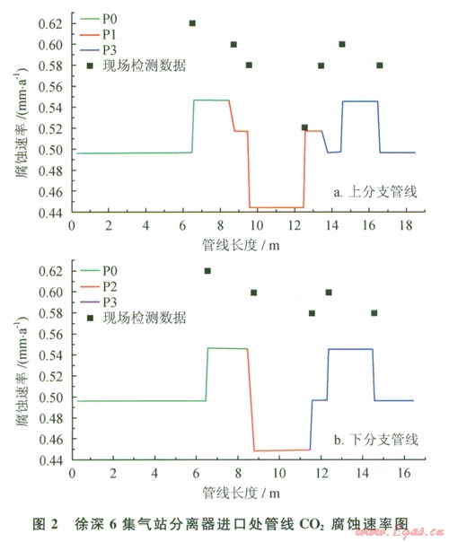 由計(jì)算數(shù)據(jù)可以得出,在管道的人口水平管道處,平均腐蝕速率保持在0.49mm/a,隨著流體介質(zhì)從L0管段流入Ll管段,管道由水平管段轉(zhuǎn)為鉛直管段,平均腐蝕速率升高,保持在0.55mm/a。在第一個(gè)T形管處管段的腐蝕速率有了一定程度的變小,L2與L4鉛直管線的腐蝕速率減至0.52mm/a,L3與L5水平管線的腐蝕速率減至0.45mm/a。在第二個(gè)T形管處介質(zhì)流體合流,腐蝕速率也增至0.50mm/a,在L7段處的管道鉛直下降,腐蝕速率升到0.55mm/a,最后在L8管段處達(dá)到穩(wěn)定。按照NACE標(biāo)準(zhǔn)RP-0775-91[12]中對腐蝕程度的規(guī)定,該條集氣站管線腐蝕率大于0.254mm/a,已發(fā)生極嚴(yán)重腐蝕。中國特種設(shè)備檢測研究院于2011年利用OLYMPUS 38DLPLUS超聲波測厚儀對該管線的重點(diǎn)管段處(彎頭及T形管)進(jìn)行檢測,由于重點(diǎn)管段處的腐蝕情況略高于平均腐蝕預(yù)測率,故該模擬結(jié)果與現(xiàn)場工況的檢測結(jié)果較吻合[13],從而說明本文采用模擬方法是可行的,為下面繼續(xù)分析CO2分壓對腐蝕速率的影響奠定基礎(chǔ)。