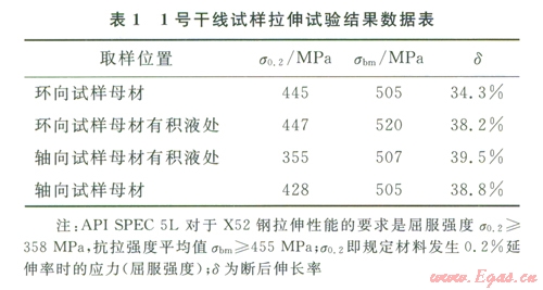 為檢驗(yàn)集氣干線長(zhǎng)期服役后的材料機(jī)械性能,對(duì)管線試樣進(jìn)行了屈服強(qiáng)度試驗(yàn),試驗(yàn)結(jié)果見(jiàn)表l。