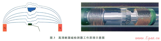 智能漏磁內(nèi)腐蝕檢測(cè)技術(shù)采用磁感應(yīng)原理:是根據(jù)鋼管被永久磁鐵磁化后,當(dāng)鋼管中無(wú)缺陷時(shí),磁力線絕大部分通過(guò)鋼管;當(dāng)管壁變薄,管內(nèi)、外壁局部被磨損,有腐蝕坑、凹坑、通孔和裂紋等缺陷時(shí),鋼管缺陷處的磁阻變大,聚集在管壁的部分磁通向外擴(kuò)張,磁力線發(fā)生彎曲并且有一部分磁力線泄漏出鋼管表面,用磁感應(yīng)元件在鋼管表面相對(duì)切割磁力線產(chǎn)生感應(yīng)電信號(hào),通過(guò)對(duì)感應(yīng)電信號(hào)的特征提取來(lái)對(duì)缺陷進(jìn)行定性和定量分析[9]。