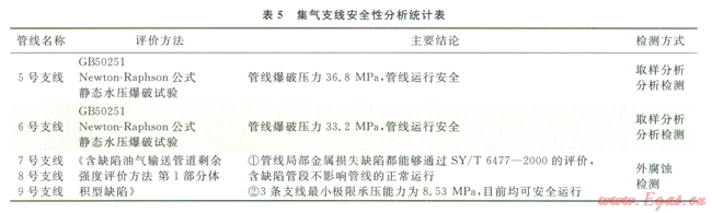 對(duì)兩條截取管樣的集氣支線和3條進(jìn)行外腐蝕檢測(cè)的集氣支線安全性分析的結(jié)果見(jiàn)表5。