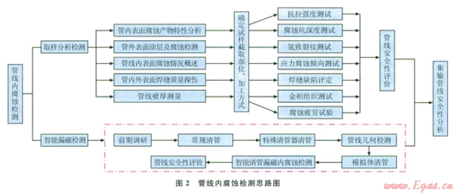 靖邊氣田主要采用取樣分析檢測(cè)和智能漏磁內(nèi)腐蝕檢測(cè)技術(shù)對(duì)開(kāi)展管線內(nèi)腐蝕檢測(cè)工作,檢測(cè)思路如圖2所示。