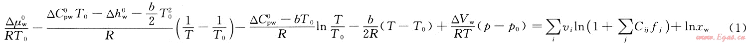 式中:△Cpw0、△hw0為T0時(shí)β相與純水相的焓差、熱容差;△μw0為標(biāo)況時(shí)完全空的天然氣水合物結(jié)晶晶格(β相)與水的化學(xué)位偏差;b為表示熱容的溫度系數(shù);μβ為完全空的天然氣水合物晶格中水的化學(xué)位;△Vw為β相和w相(富水相)間的摩爾焓差和體積差;vi為i型空腔的百分?jǐn)?shù);Cij為組分對(duì)型空腔的Langmiur常數(shù);fj為混合氣體中組分的逸度,Pa;xw為富水相中水的摩爾分?jǐn)?shù)。
