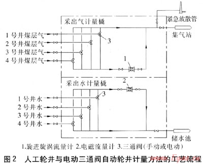 煤層氣田通常是大面積聯(lián)片開采,井間距小,一般采取叢式井的開采方式。1座井場可有多口單井,因此氣水產(chǎn)量的計量就成為煤層氣田地面建設工程中工作量最大、內(nèi)容最繁瑣的部分。以常見的4口單井井場為例,對井場采用的3種計量方法的工藝流程進行介紹。在人工輪井計量方法和自動輪井計量方法中,各口單井均連續(xù)工作,但間歇計量。根據(jù)計量結果,推算產(chǎn)量。