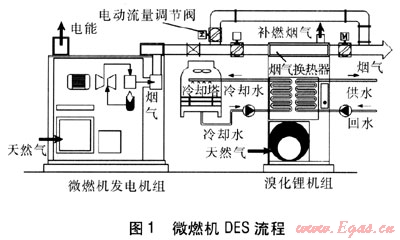 微燃機(jī)DES由微燃機(jī)發(fā)電機(jī)組、煙氣補(bǔ)燃型溴化鋰吸收式機(jī)組(以下簡稱溴化鋰機(jī)組)、冷卻塔等組成,見圖1。天然氣在微燃機(jī)燃燒室內(nèi)燃燒,熱能轉(zhuǎn)換為高品位電能輸出,煙氣引入溴化鋰機(jī)組,利用煙氣余熱生產(chǎn)冷水或熱水。當(dāng)煙氣余熱量不足以滿足空調(diào)負(fù)荷或供暖負(fù)荷時(shí),利用天然氣補(bǔ)燃以提高溴化鋰機(jī)組的制冷或制熱能力。