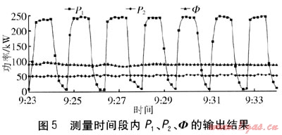 測(cè)量時(shí)間段內(nèi)qg1、qg2的測(cè)量結(jié)果見圖3 pf1,pf2的測(cè)量結(jié)果見圖4。上述運(yùn)行參數(shù)均屬一次運(yùn)行參數(shù),微燃機(jī)發(fā)電機(jī)組燃?xì)饣瘜W(xué)熱功率P1、溴化鋰機(jī)組補(bǔ)燃燃?xì)饣瘜W(xué)熱功率P2、溴化鋰機(jī)組制熱量Φ等屬于二次計(jì)算數(shù)據(jù),這些二次計(jì)算數(shù)據(jù)由CAT系統(tǒng)計(jì)算輸出,部分輸出結(jié)果見圖5。
