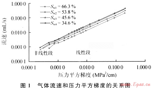 致密低滲透氣藏普遍具有低孔、低滲、束縛水飽和度高的特點(diǎn),由于細(xì)小孔隙喉道處水化膜的封堵作用,氣體滲流往往具有啟動(dòng)壓力梯度特征,作用于氣體兩端的壓力梯度要大于啟動(dòng)壓力梯度才能流動(dòng)[1];同時(shí)許多致密低滲透氣藏具有“應(yīng)力敏感”特征[2]。致密低滲透儲(chǔ)層巖心氣體低速滲流實(shí)驗(yàn)結(jié)果如圖1,在氣體流速和壓力平方梯度的關(guān)系圖上,線性段為達(dá)西滲流段,非線性段不通過(guò)坐標(biāo)原點(diǎn),和x軸的交點(diǎn)即為啟動(dòng)壓力梯度,儲(chǔ)層含水飽和度越高,啟動(dòng)壓力梯度作用才明顯。致密低滲透氣藏儲(chǔ)層滲透率隨有效應(yīng)力的變化如圖2??梢钥闯鲈诮祪?nèi)壓過(guò)程中,滲透率隨有效應(yīng)力的增大而減小,在儲(chǔ)層壓力恢復(fù)的過(guò)程,由于儲(chǔ)層發(fā)生了部分塑性變形,滲透率并不能恢復(fù)到初值。
