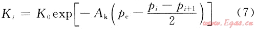 通過(guò)巖心應(yīng)力敏感實(shí)驗(yàn),發(fā)現(xiàn)巖石滲透率與有效應(yīng)力滿足指數(shù)關(guān)系,每一個(gè)網(wǎng)格節(jié)點(diǎn)i的滲透率可表征為有效應(yīng)力的函數(shù)[4]: