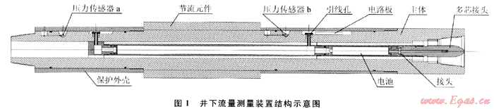 該測(cè)量裝置內(nèi)置壓力傳感器和數(shù)據(jù)采集卡,并通過多芯接頭與隨鉆測(cè)井(MWD)裝置連接??蓪?shí)時(shí)采集壓力傳感器的信號(hào)并進(jìn)行簡單處理,之后把采集的壓力數(shù)據(jù)通過MWD傳至地面進(jìn)行分析,即可得到井底實(shí)時(shí)的環(huán)空流速(流量)。