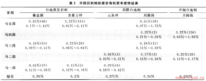 從中可見(jiàn):馬五段膏鹽湖和局限海有機(jī)質(zhì)豐度最高,均為0.35%;而含膏云坪微相較低,僅為0.22%;在馬四段,沉積環(huán)境差異導(dǎo)致有機(jī)質(zhì)豐度不同的現(xiàn)象較明顯,局限海有機(jī)質(zhì)豐度明顯比開闊海高,兩者分別為0.25%和0.22%;馬三段盡管形成于水體相對(duì)封閉的環(huán)境,但是各微相有機(jī)質(zhì)豐度均很低;馬二段與馬四段類似,即局限臺(tái)地比開闊臺(tái)地有機(jī)質(zhì)豐度略高,云灰坪有機(jī)碳含量為0.26%,開闊海為0.25%;馬一段云灰坪和膏鹽湖有機(jī)碳含量較高,分別為0.29%和0.24%。