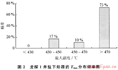 下奧陶統(tǒng)海相碳酸鹽巖缺乏陸源鏡質(zhì)組,故常用等效鏡質(zhì)組反射率(VRo)來(lái)確定其熱演化程度。研究區(qū)下古生界等效鏡質(zhì)體反射率全部大于1.8%,絕大部分大于2.0%,說(shuō)明烴源巖全部熱演化至高過(guò)成熟階段,大部分演化至過(guò)成熟階段。此外,龍?zhí)?井83%的烴源巖樣品,其Tmax>450℃(圖2),