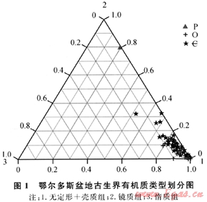 根據(jù)有機(jī)質(zhì)顯微組分特征可以確定有機(jī)質(zhì)的類型。這種方法確定的類型偏重于對(duì)有機(jī)質(zhì)來(lái)源的判斷。筆者將顯微組分劃分為3部分:無(wú)定形+殼質(zhì)組;鏡質(zhì)組;惰質(zhì)組。其中在寒武系和奧陶系無(wú)定形組分的含量均大于80%。以這3部分為端元,作出劃分有機(jī)質(zhì)類型的三角圖(圖1)。