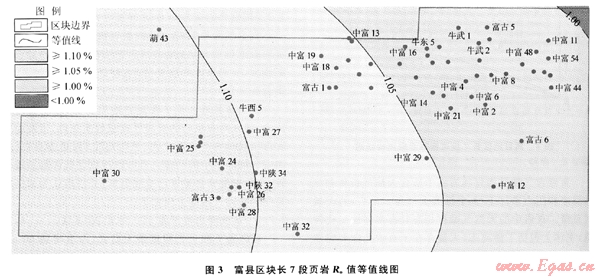 根據(jù)美國和加拿大的勘探開發(fā)結果,形成頁巖氣的頁巖有機質成熟度(Ro)值為0.4%~3.0%。如Barnett頁巖的成熟度就屬于中等-較高范圍,Ro為1.0%~2.1%[9]。區(qū)域上對延長組有機質熱演化的研究表明,早白堊世中期進入成熟門限,早白堊世末期進入大量生烴門限,古近紀進入高成熟期。富縣地區(qū)曾經是埋深最大的生油中心,Ro值大于1%,有機質成熟度較高。該區(qū)中富2、中富30、葫43井主要生油巖長7段鏡質體反射率分別為1.13%、1.06%、1.10%;總體上西部頁巖有機質演化程度高于東部(圖3)。