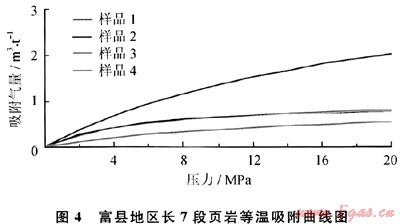為了解該區(qū)頁巖的吸附能力,在鉆井巖心中采集4個樣品進行等溫吸附試驗,試驗條件為:試驗溫度為35℃(大約相當于1000m埋深的地溫),采用純甲烷在平衡濕度條件進行,試驗結果為:蘭氏體積為0.98~3.96cm3/g,平均為1.75cm3/g;蘭氏壓力為5.19~19.23MPa,平均為11.89MPa(圖4)。