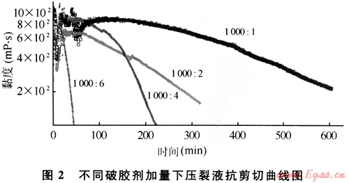 針對大規(guī)模加砂壓裂對壓裂液的要求,重點評價了壓裂液的抗長剪切能力和徹底破膠性能。