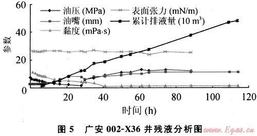 廣安002-X36井施工結(jié)束45min后開井排液。壓后自噴返排壓裂液173.7m3后出氣。至2007年9月27日,該井累計排液530m3,殘液的性能分析見圖5。