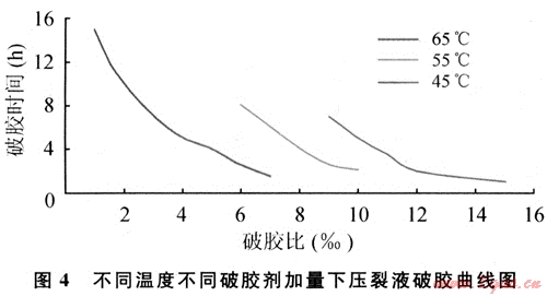 根據(jù)軟件模擬,考察了不同的破膠劑加量在不同溫度下的破膠情況(圖4)。施工過程中根據(jù)每段壓裂液在地層下滯留的時間和溫度情況,結(jié)合圖2、4的實驗結(jié)果,設(shè)計破膠劑追加比例。
