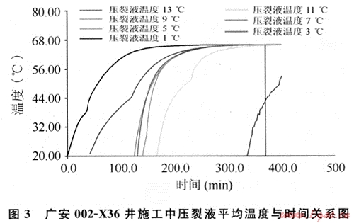 在水力壓裂施工過程中,由于儲層溫度與地面溫度相差較大,當大量具有地面溫度的壓裂液進入裂縫中時,在裂縫中溫度有明顯的變化。廣安002-X36井施工設(shè)計泵注程序見表1。壓裂軟件模擬施工時各階段壓裂液平均溫度與時間的關(guān)系見圖3。